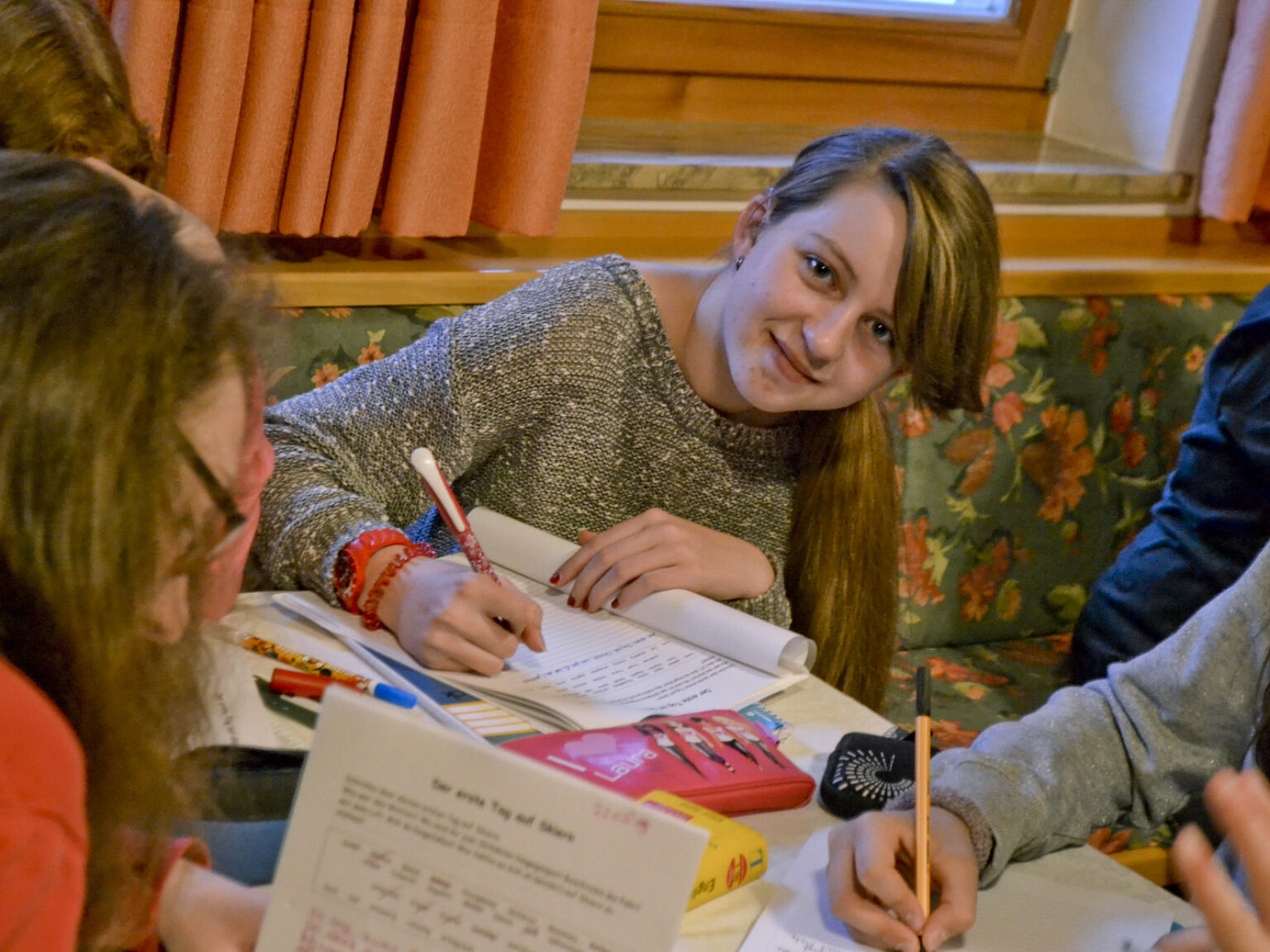 Aber am coolsten war der Party-Abend. Delfina und ich sind runter in den Keller gegangen. Da haben die Lehrer Musik angemacht und wir haben getanzt. Wir machten auch Stopptanz und andere Spiele und gerade war es so schön, da sagte Herr Eufinger, dass wir nur noch ein Lied hören können, dann müssen wir ins Bett gehen. Das war sehr schade. (Jenny)