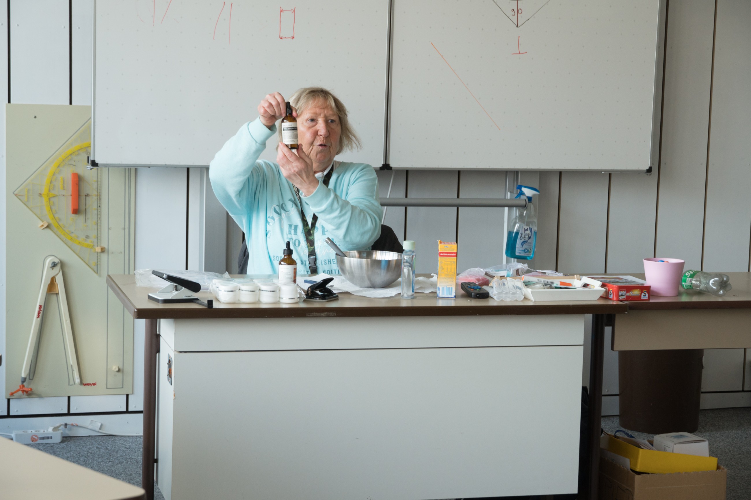 „Beim Pressen braucht man viel Kraft, das machen wir zusammen“, gebärdet Kate.